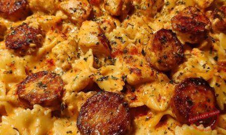 Cremige Schmetterlingsnudeln mit Hähnchen und Wurst ZUTATEN 350 g Schmetterlingsnudeln (Farfalle) 350 g Hähnchenbrust, in mundgerechte Stücke geschnitten 300 g Räucherwurst...