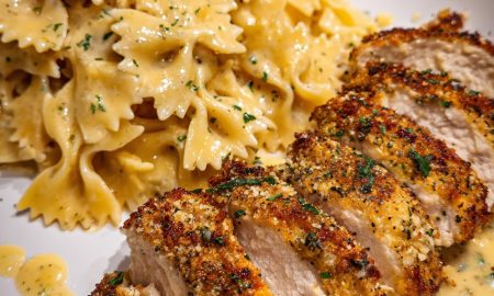 Hähnchen mit Parmesan-Kruste und cremigen Farfalle ZUTATEN Für das Hähnchen: 2 Hähnchenbrustfilets 50 g Paniermehl 50 g fein geriebener Parmesan 1 TL...