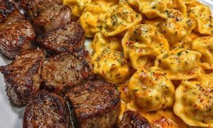 Knoblauch-Butter-Steak mit cremigen Käse-Tortellini ZUTATEN Für die Steak-Würfel: 700 g Rinderhüftsteak in mundgerechte Würfel geschnitten 1 TL Salz 1/2 TL schwarzer Pfeffer...