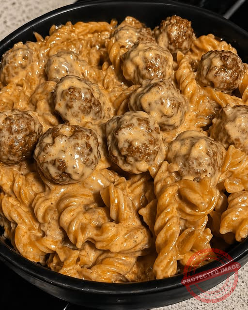 Vermengen: Die Fleischbällchen und die gekochten Nudeln in die Pfanne geben. Alles gut durchschwenken, bis die Soße schön dickflüssig an den Nudeln haftet.