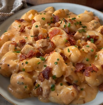 Den geriebenen Käse unterrühren, bis er geschmolzen ist. Den knusprigen Speck zerbröseln und zusammen mit dem Schnittlauch über das Gericht streuen.