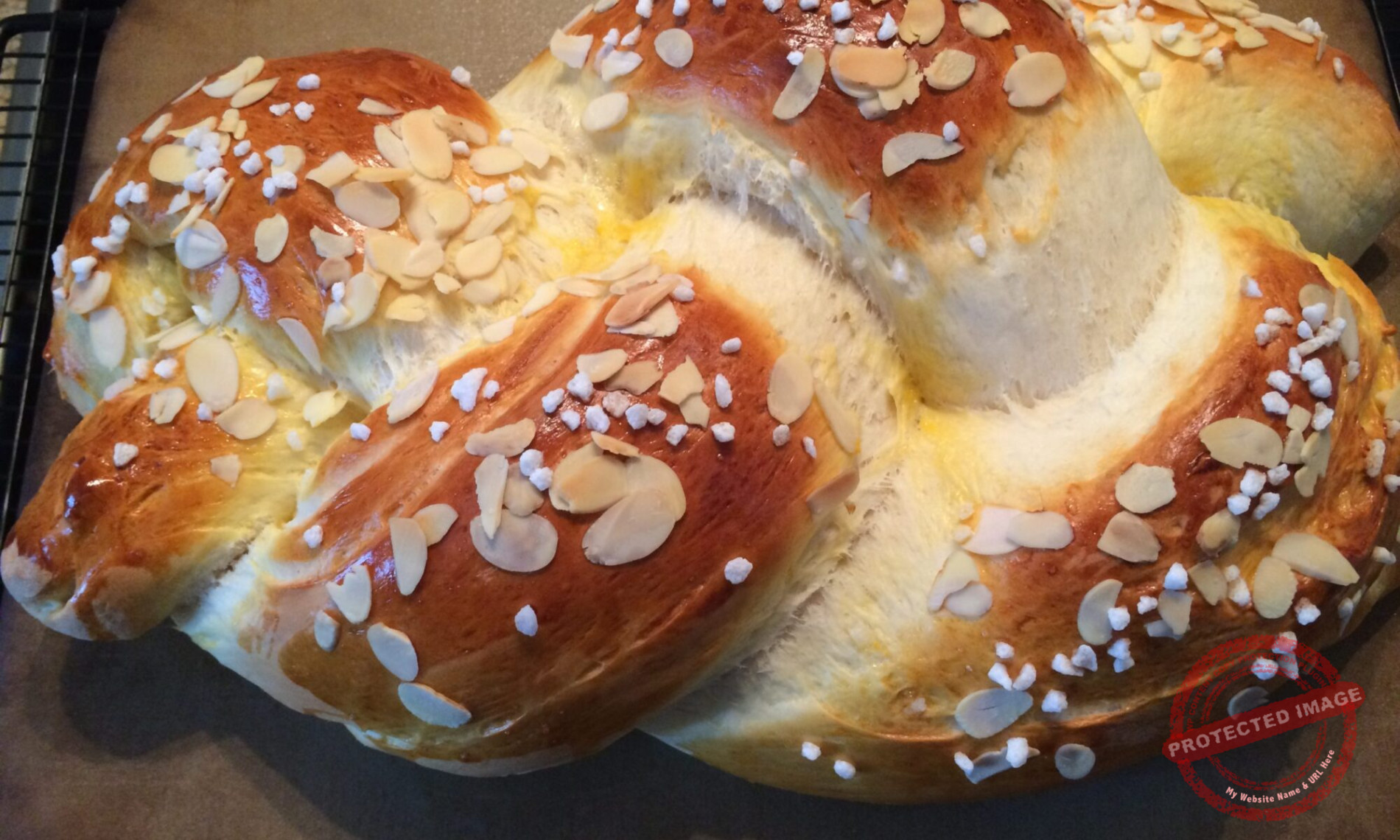Das Ei von vorher mit 1 EL Milch vermengen und den Zopf damit bestreichen. Vor dem Backen noch mit Hagelzucker verzieren.