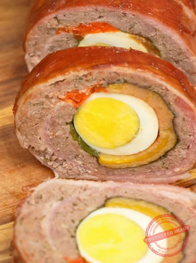 Füllen: Den Käse, Spinat, Pilze, Paprika und die Banane auf dem Fleisch verteilen. Die hartgekochten Eier in einer Reihe in die Mitte legen.
