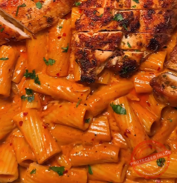 Vermengen: Die Pasta in die Sauce geben und gut durchschwenken. Die Hähnchenstreifen darüberlegen und mit Petersilie garnieren.