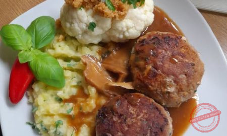 Herzhafte Fleischpflanzerl mit Kartoffelstampf und Blumenkohl ZUTATEN Für die Fleischpflanzerl (Frikadellen): 500 g Hackfleisch (gemischt oder Rind) 1 altes Brötchen (in...