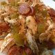 Die Paprika und die Zwiebeln putzen und fein schneiden. Beides mit den Pulverpaprikasorten und den Pasten zum Fleisch geben und gründlich verrühren.