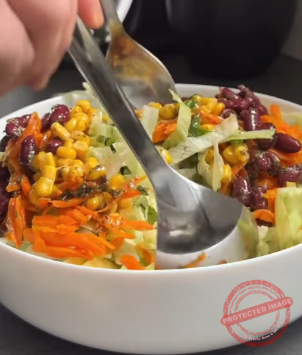 Mischen: Die Kartoffelwürfel mit allen restlichen Zutaten (Gemüse, Mais, Bohnen, Kräuter und Salat) in eine große Schüssel geben.