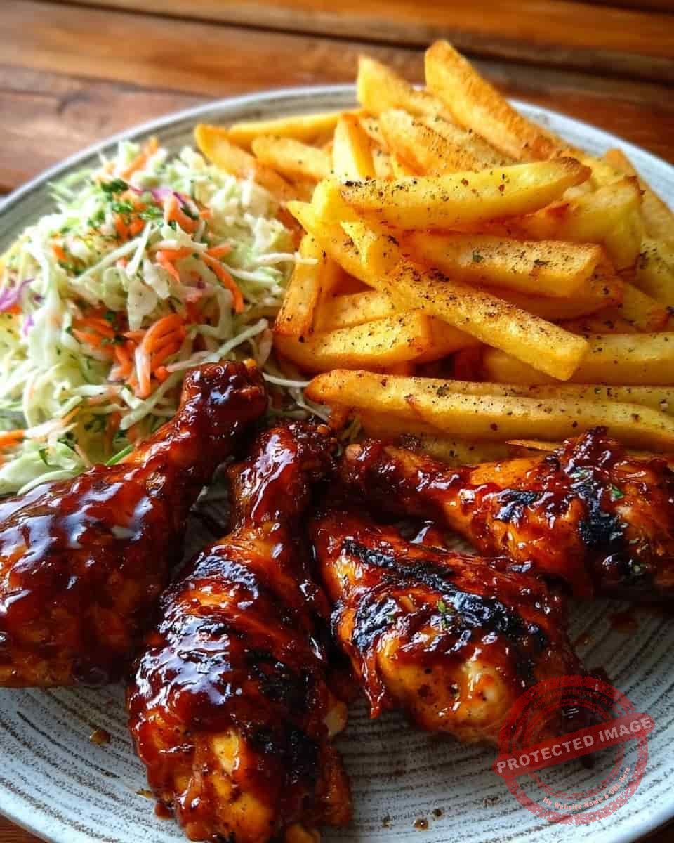 Anrichten: Die klebrigen BBQ-Hähnchenschenkel zusammen mit den knusprigen Pommes und dem frischen Coleslaw servieren. Ein unvergessliches Comfort-Food-Essen für die ganze Familie!