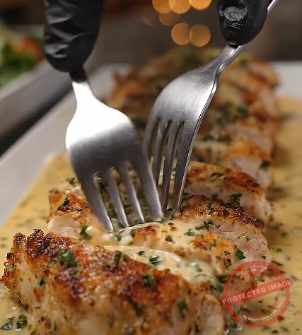 Vollenden: Das Hähnchen in Streifen schneiden (wie auf dem Bild) und zurück in die cremige Soße legen oder die Soße großzügig über das Fleisch gießen.